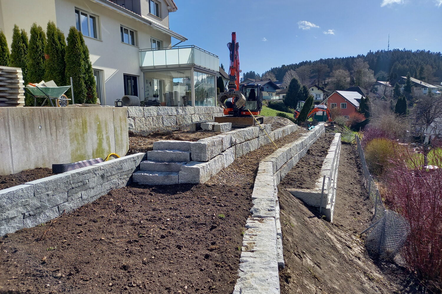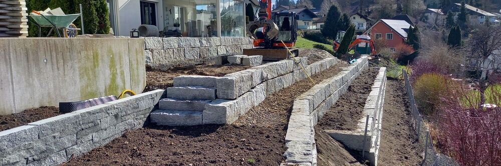 Um abschüssiges Gelände auszuebnen und nutzbar zu machen empfehle ich Ihnen, mit Stützmauern das Terrain anzugleichen, ob Blockstein, Naturstein oder Sichtbeton - ich weiss wie es geht.